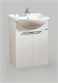 Závěsná umyvadlová skříňka s umyvadlem šířky 55 cm řady Lebon Elements B, provedení bílá nebo dub. Včetně dvou chromových úchytek. Dvířka mají pneumatické dorazy.
